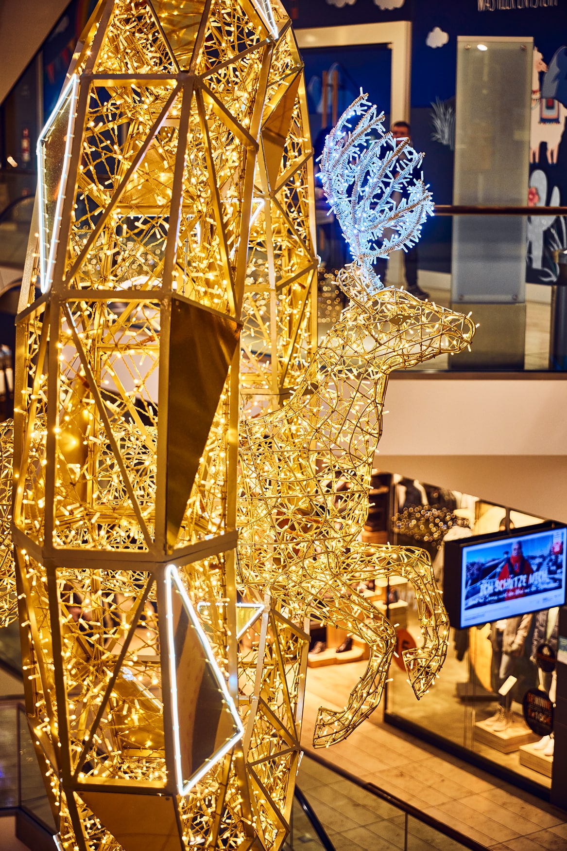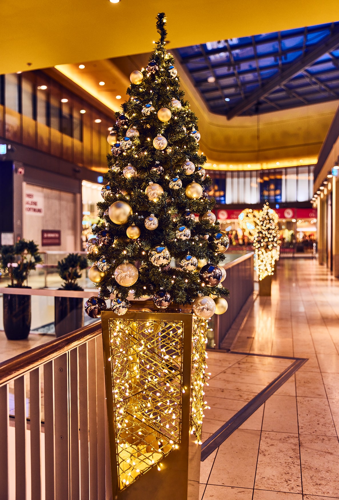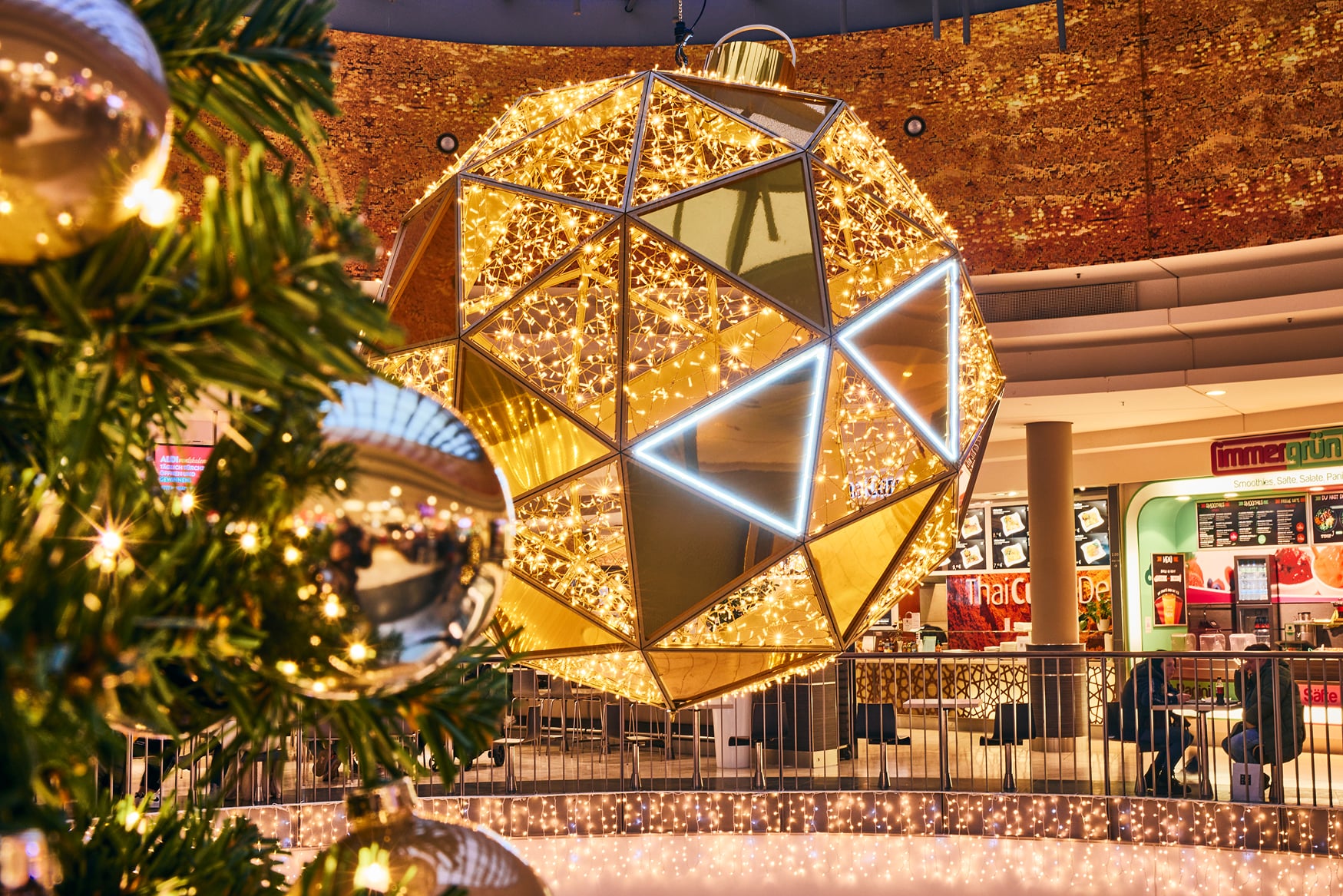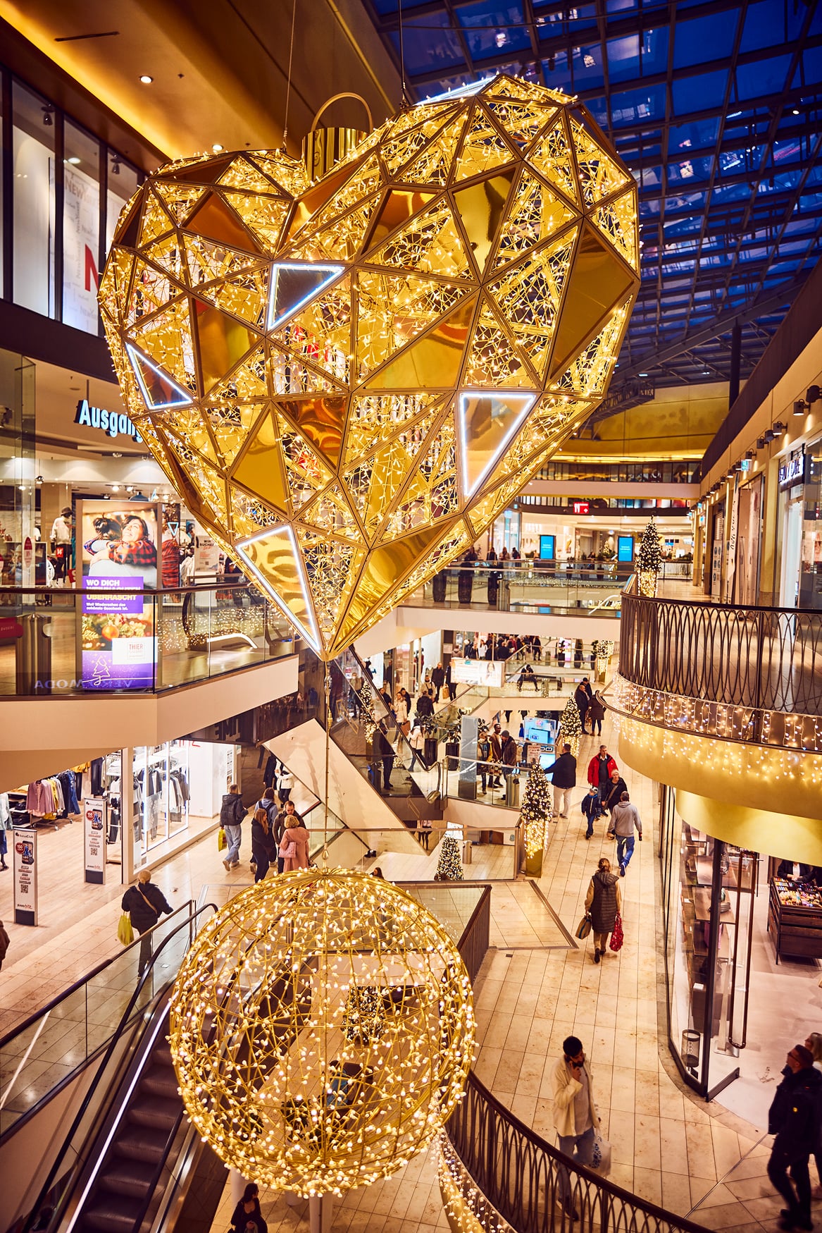 Unsere XXL-Dekorationsobjekte in diesem Innenstadt-Center kombinieren edles Gold mit tollen Lichteffekten. In jedem Lichthof hängt ein anderes, spektakuläres XL-Highlight mit eigenem Charakter. Dennoch passen alle Elemente durch Materialität und Design zusammen und verleihen dem Ort festliche Eleganz. Perfekt für beeindruckende Auftritte in der Weihnachtszeit.